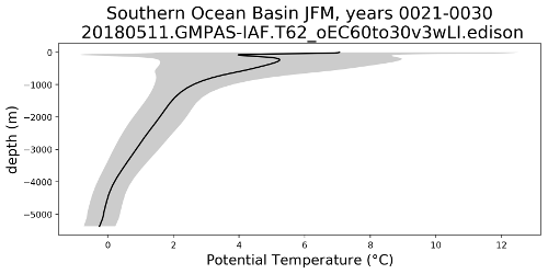 An analysis task for plotting depth profiles of temperature, salinity, potential density, etc. averaged over regions and in time. The plots also include a measure of variability (the standard deviation in space and time).