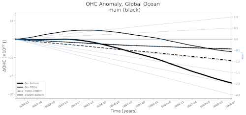 Recently, a right-hand axis and an associated set of lines has been added to the OHC anomaly time series. This axis and these lines show the equivalent top-of-atmosphere energy flux (\(W/m^2\)) that the ocean heat anomaly would induce.
